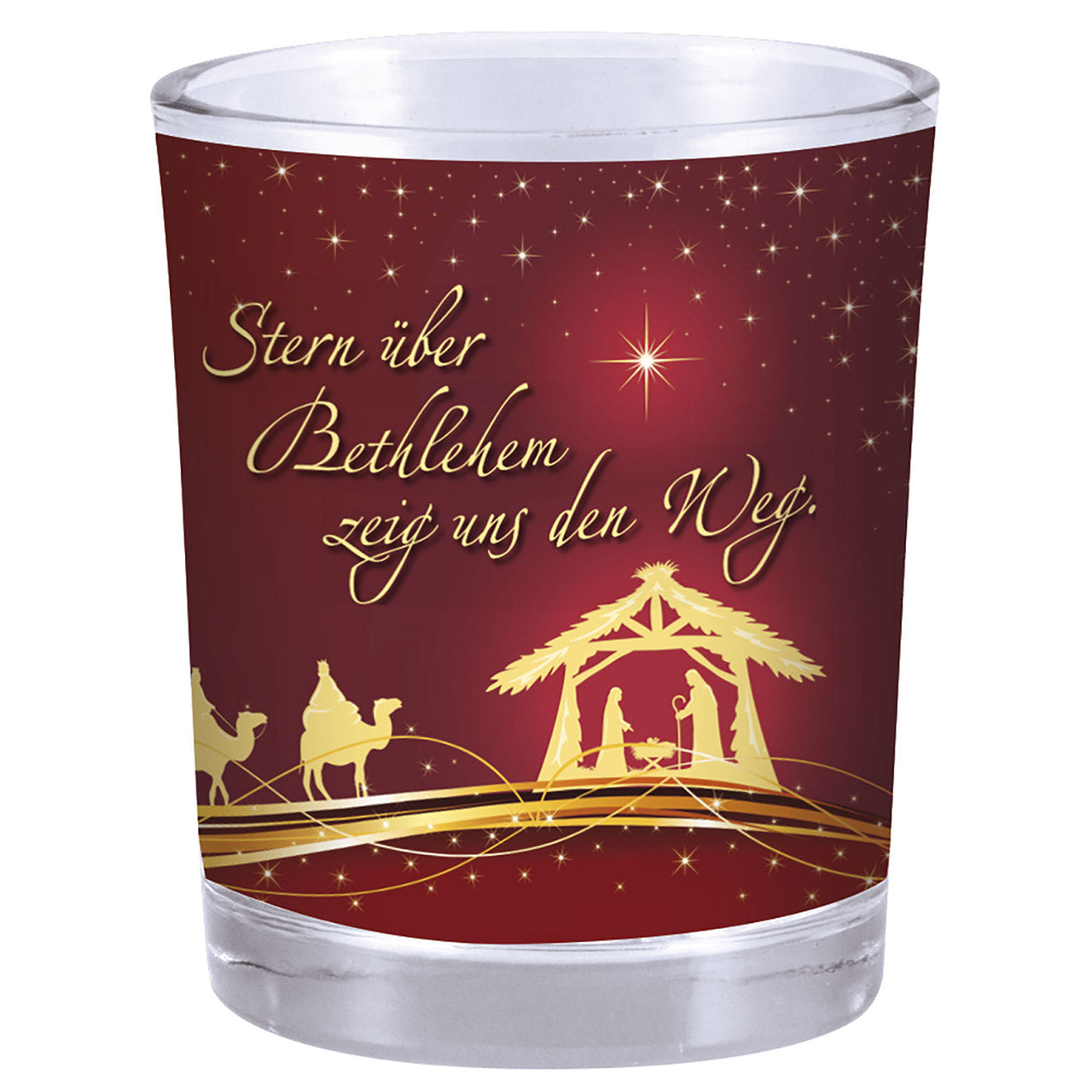 Durch dieses für Teelichter geeignete Votivglas leuchtet ein inniger Weihnachtswunsch hindurch: Stern über Bethlehem, zeig uns den Weg.