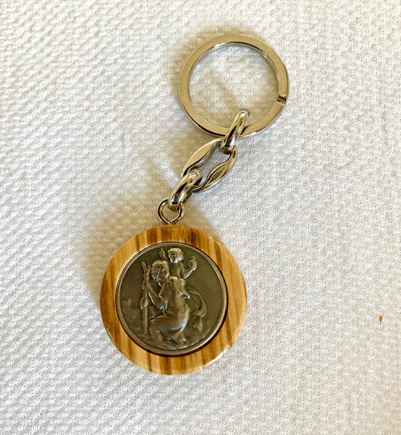 Christophorus-Schlüsselanhänger mit Ummantelung aus Olivenholz